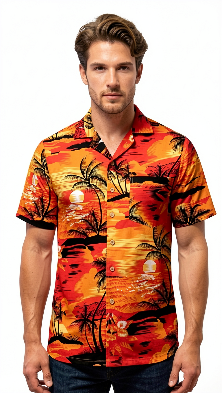 Dyk ned i den tropiske stemning med vores eksklusive hawaiiskjorte "Aften på Hawaii"! Det lysende orange design udstråler ren livsglæde og bringer med palmer, solnedgange, små øer og eksotiske blomster ægte feriestemning ind i dit klædeskab.