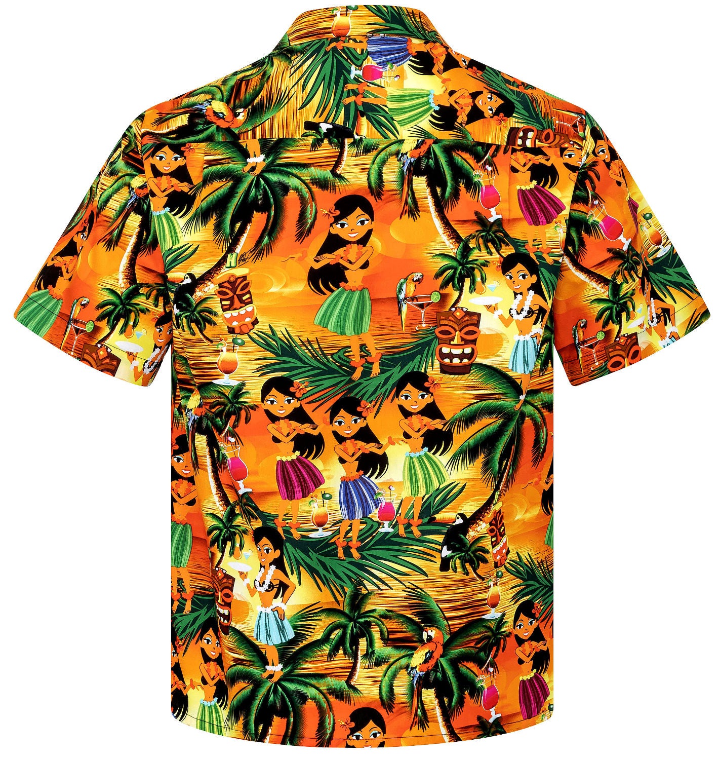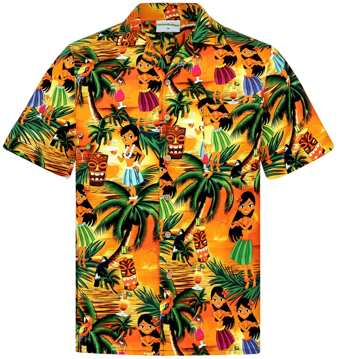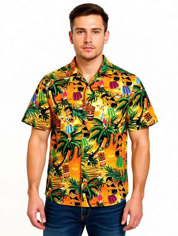 Den iøjnefaldende orange skjorte er et sandt blikfang: berusede Aloha-piger i lystig feststemning, omgivet af grønne palmer, sprudlende drinks og en umiskendelig feststemning. Denne skjorte råber nærmest på godt humør og skaber samtale – uanset hvor du bærer den.