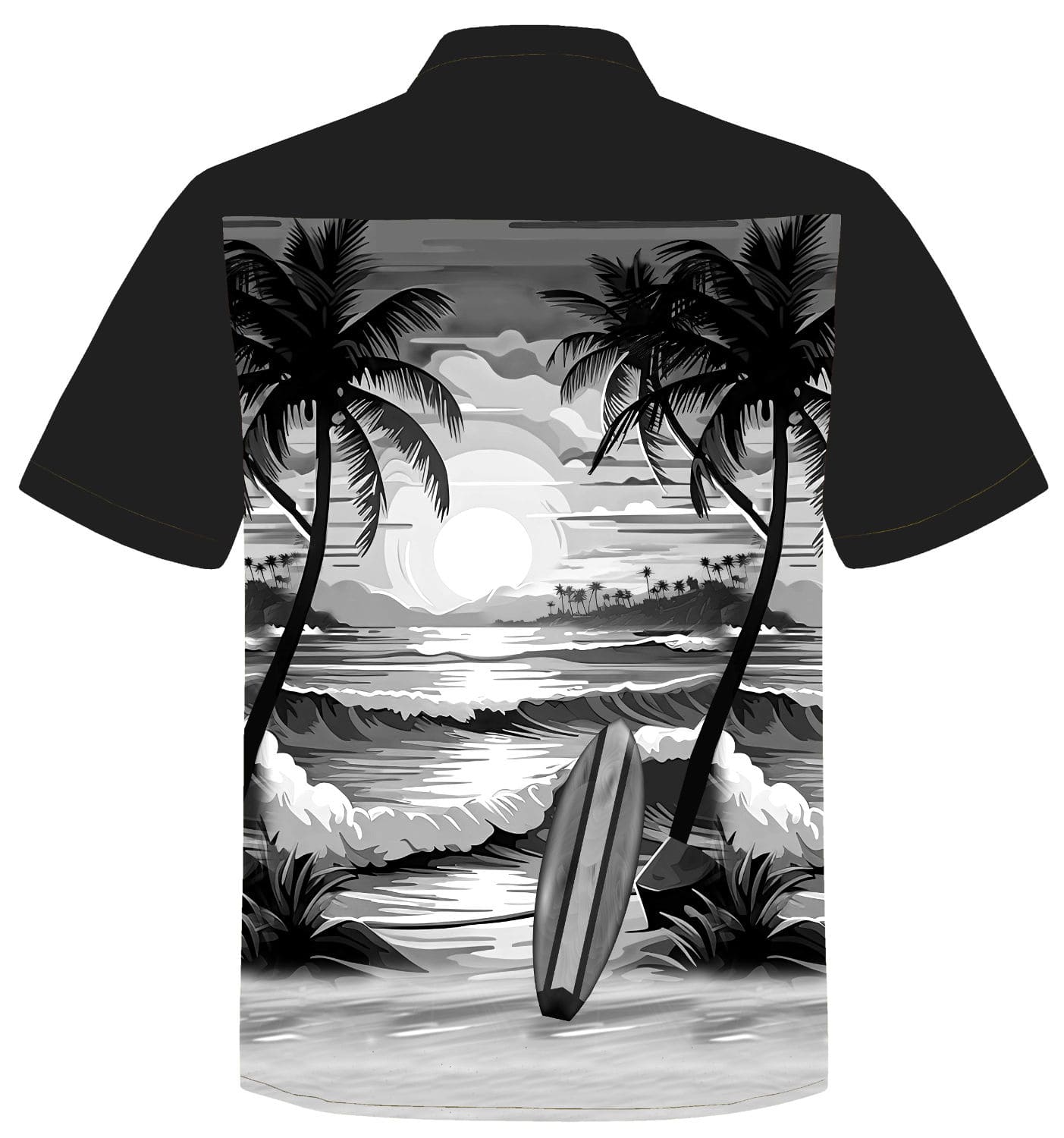 Skjortens gråsort farvespil, kombineret med sorte palmer og en surfer, der i forgrunden rider på dagens sidste bølger, fanger den afslappede stemning ved en solnedgang på stranden perfekt. Den smukke solnedgang i baggrunden lader dig mærke magien ved "Beach Night" overalt – om det er til en drink med venner eller en rolig aften ved havet.
