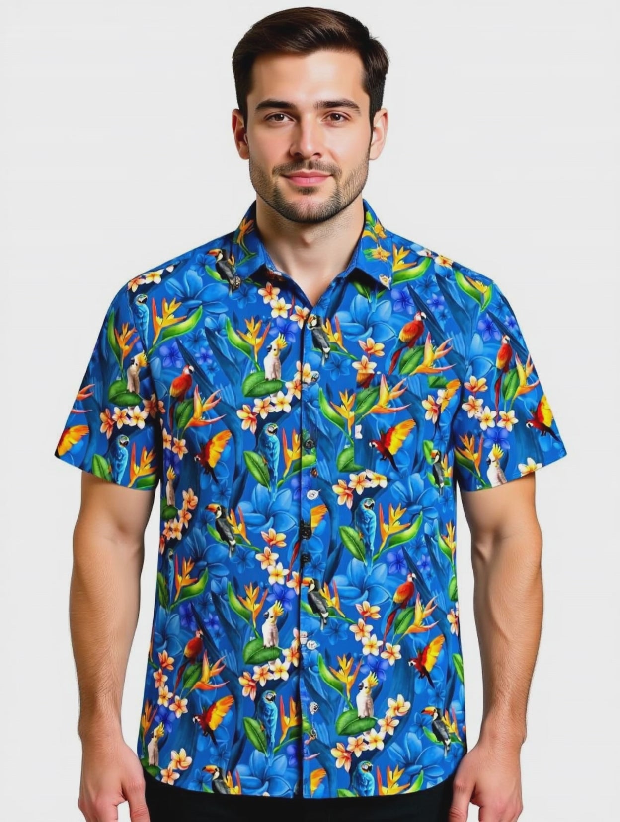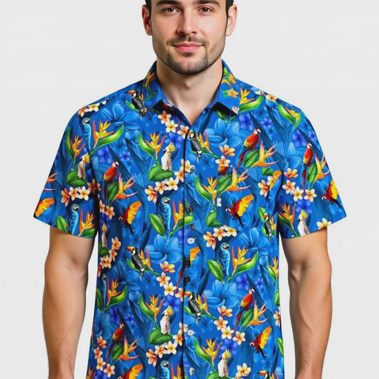 Das lebendige Design des Hemds zeigt bunte Papageien, die zwischen üppigen Blumen auf einem eleganten blauen Hintergrund fliegen. Die Kombination aus tropischen Vögeln und floralen Akzenten bringt die Farbenpracht der Natur in dein Outfit und sorgt für eine fröhliche, aber gleichzeitig stilvolle Ausstrahlung.