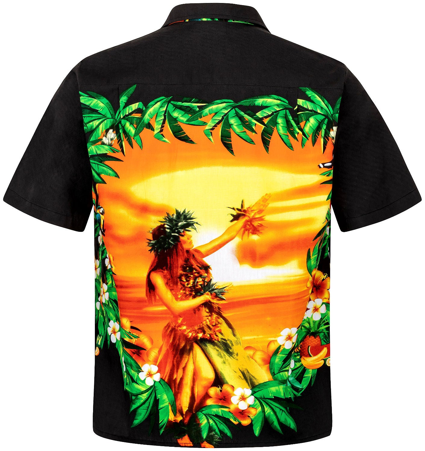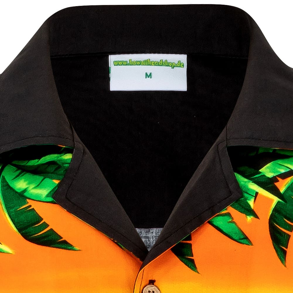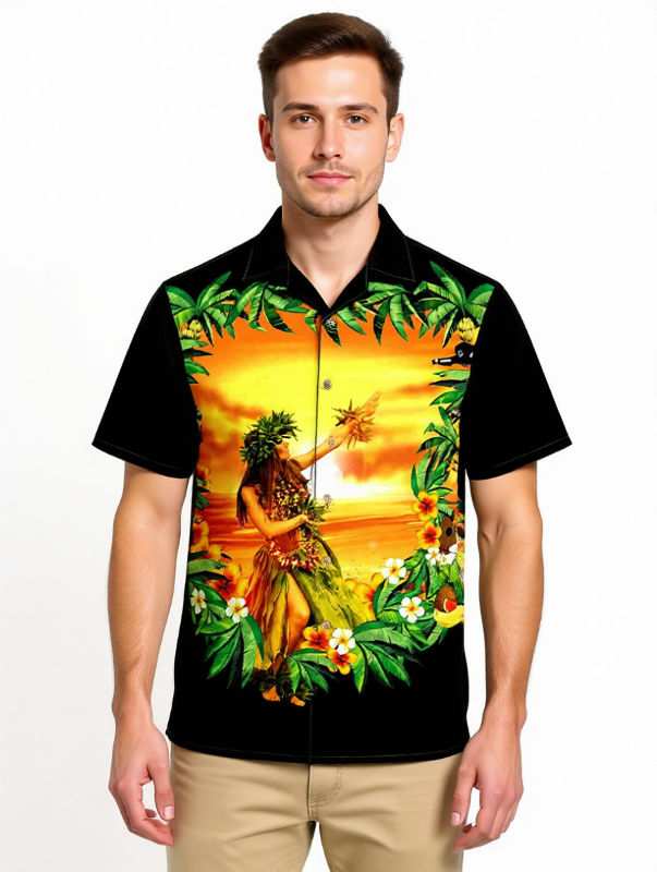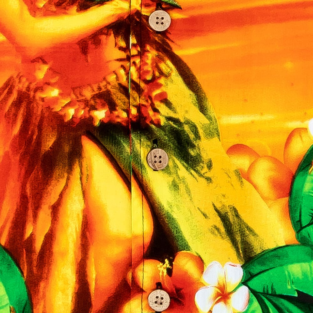 Hergestellt aus 100% reiner Baumwolle garantiert es höchsten Tragekomfort, während die echten Kokosnuss-Knöpfe jedem Detail natürliche Eleganz verleihen. Das kunstvolle Design zeigt eine atemberaubende hawaiianische Schönheit, die im goldenen Sonnenuntergang erstrahlt – umgeben von sanft wiegenden Palmen und einer farbenprächtigen Blumenpracht.