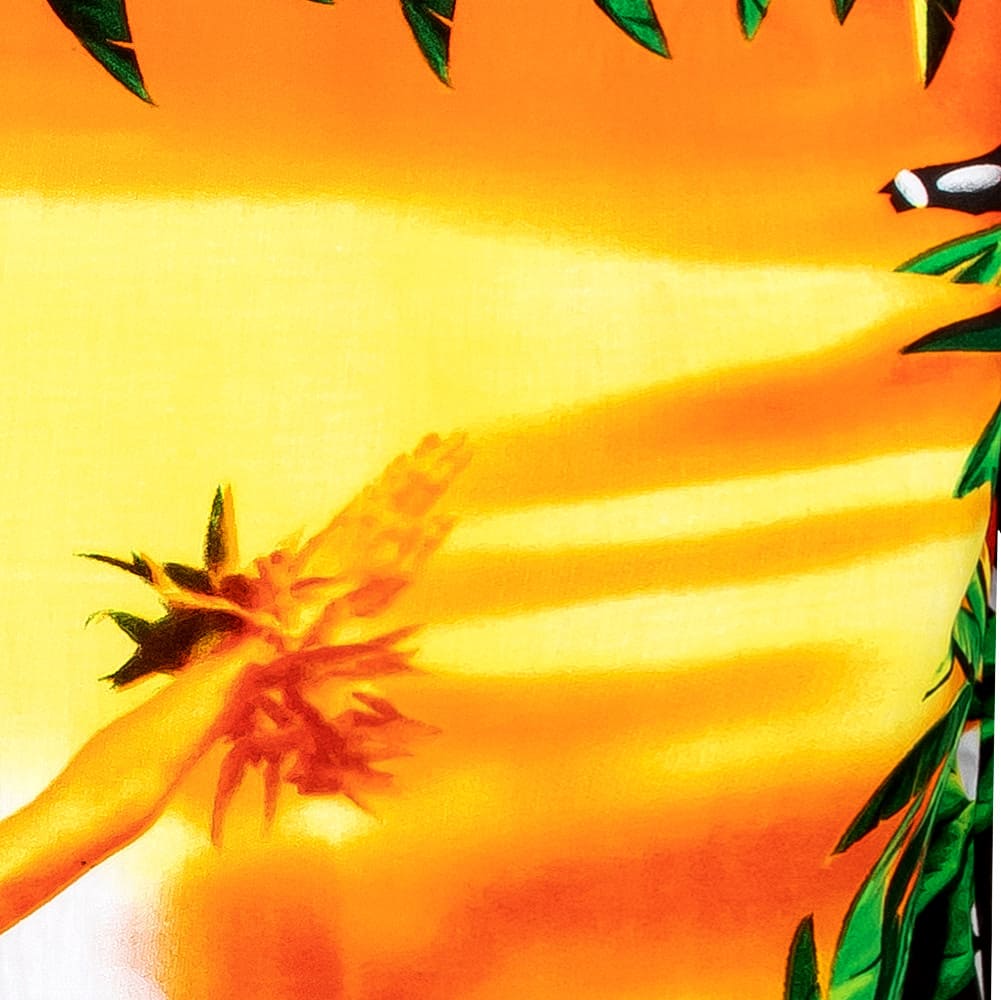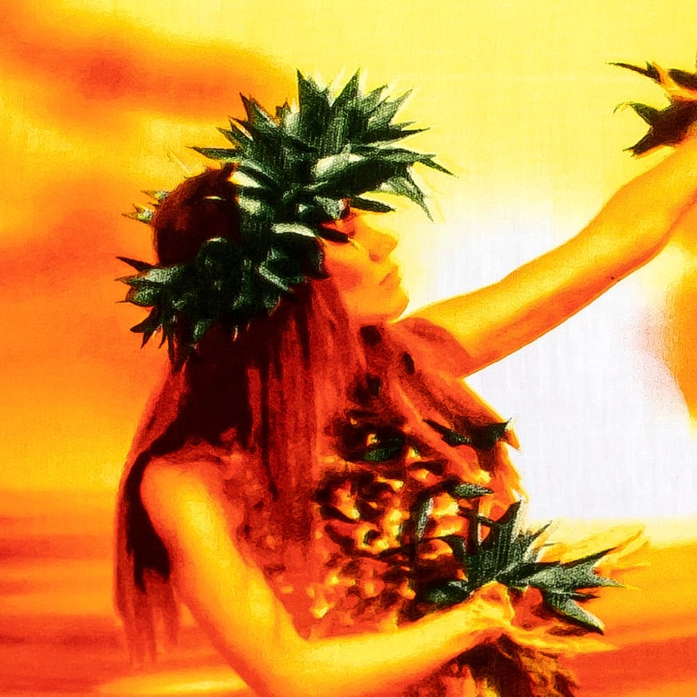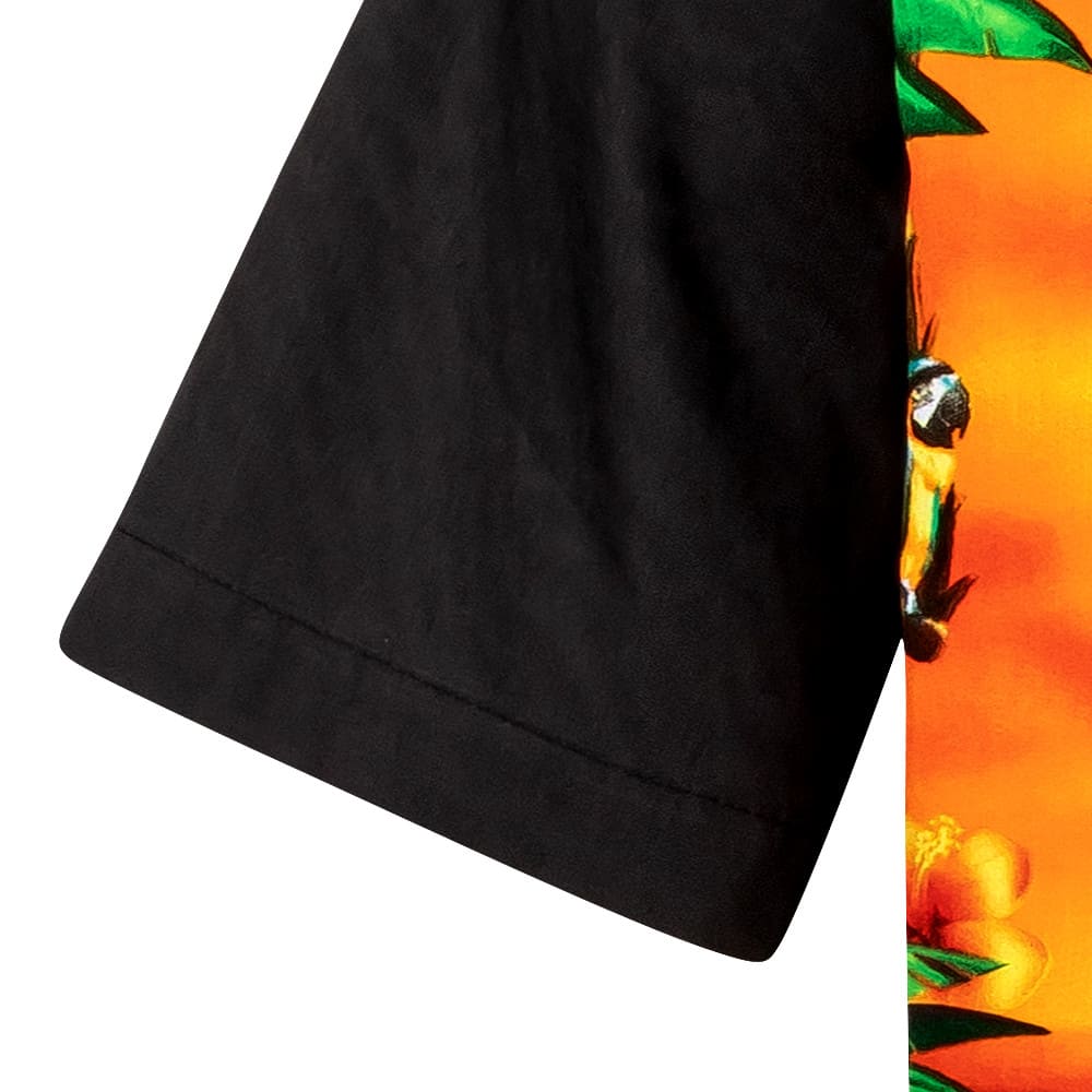 Hergestellt aus 100% reiner Baumwolle garantiert es höchsten Tragekomfort, während die echten Kokosnuss-Knöpfe jedem Detail natürliche Eleganz verleihen. Das kunstvolle Design zeigt eine atemberaubende hawaiianische Schönheit, die im goldenen Sonnenuntergang erstrahlt – umgeben von sanft wiegenden Palmen und einer farbenprächtigen Blumenpracht.