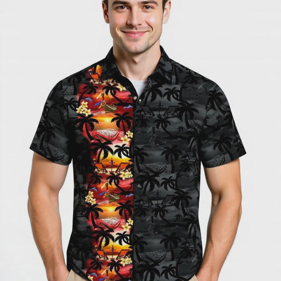 Das Design entführt dich in eine tropische Oase: schwarze Palmen, zarte Blüten, eine einladende Hängematte und bequeme Liegestühle vor einem roten Sonnenuntergang – die perfekte Kulisse für unvergessliche Momente. Der schwarze Hintergrund mit dezent eingebauten Silhouetten auf der rechten Seite des Hemdes verleiht dem Look eine formvollendete Eleganz, die das Hemd sowohl für den entspannten Abend als auch für elegante Sommeranlässe perfekt geeignet macht.