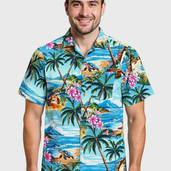 Ein tropisches Inselparadies, sanfte Wellen am Strand und majestätische Schildkröten, die das türkisfarbene Wasser erkunden – das Hawaiihemd "Turtle Island" bringt das Urlaubsgefühl direkt zu dir! Die paradiesische Strand-Landschaft mit saftig-grünen Palmen, rosa Blüten und sanften Meeresschildkröten schafft eine traumhafte Kulisse, während Berge und ein wolkenloser Himmel im Hintergrund das Design perfekt abrunden.